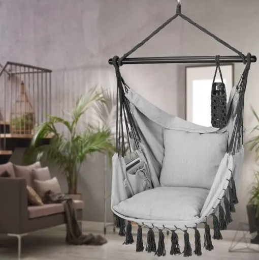Pohodlné závesné hojdacie kreslo ponúka vysoký komfort sedenia s 2 odnímateľnými vankúšmi. Vďaka integrovanému veľkému vnútornému vrecku máte mobil, tablet či knihy vždy po ruke. Praktický držiak nápojov bezpečne drží aj ťažké 1-litrové fľaše. Držiak na fľašu je možné flexibilne pripevniť na nosnú tyč. Kreslo je možné využiť na relax v interiéri aj exteriéri. Sedací kôš je pokrytý bavlnenou sieťovinou, ktorá je odolná voči poveternostným vplyvom. Vďaka mimoriadne stabilnému a kvalitnému prevedeniu a extra hrubej drevenej tyči Ø 3,8 cm možno kreslo zaťažiť až 150 kg. Vďaka komfortnému otočnému zaveseniu o 360° na pevnom oceľovom háku je možné závesné kreslo individuálne zarovnať a hojdať vo všetkých smeroch. Kreslo možno ľahko prepravovať v dodanej prepravnej taške alebo odložiť, aby sa ušetrilo miesto, keď sa nepoužíva. Závesná hojdacia stolička je ideálne aj na kempingovú dovolenku alebo viete ju vyžiť ako hojdacia sieť. Môže slúžiť ako: ratanová sedacia suprava, ratanová zostava, ratanové sedenie kresla, sedačka stoličky, stolicka kreslo stol stolik, zahradné sedenie, ratanový nábytok záhradny lehatko, alebo dreveny detský záhradný domcek pre deti, predám plechový záhradny domcek na náradie, využitelne ako altánok alebo party stan, záhradná posteľ lavička a lavica, hojdacia sieť do záhrady, hojdačka.