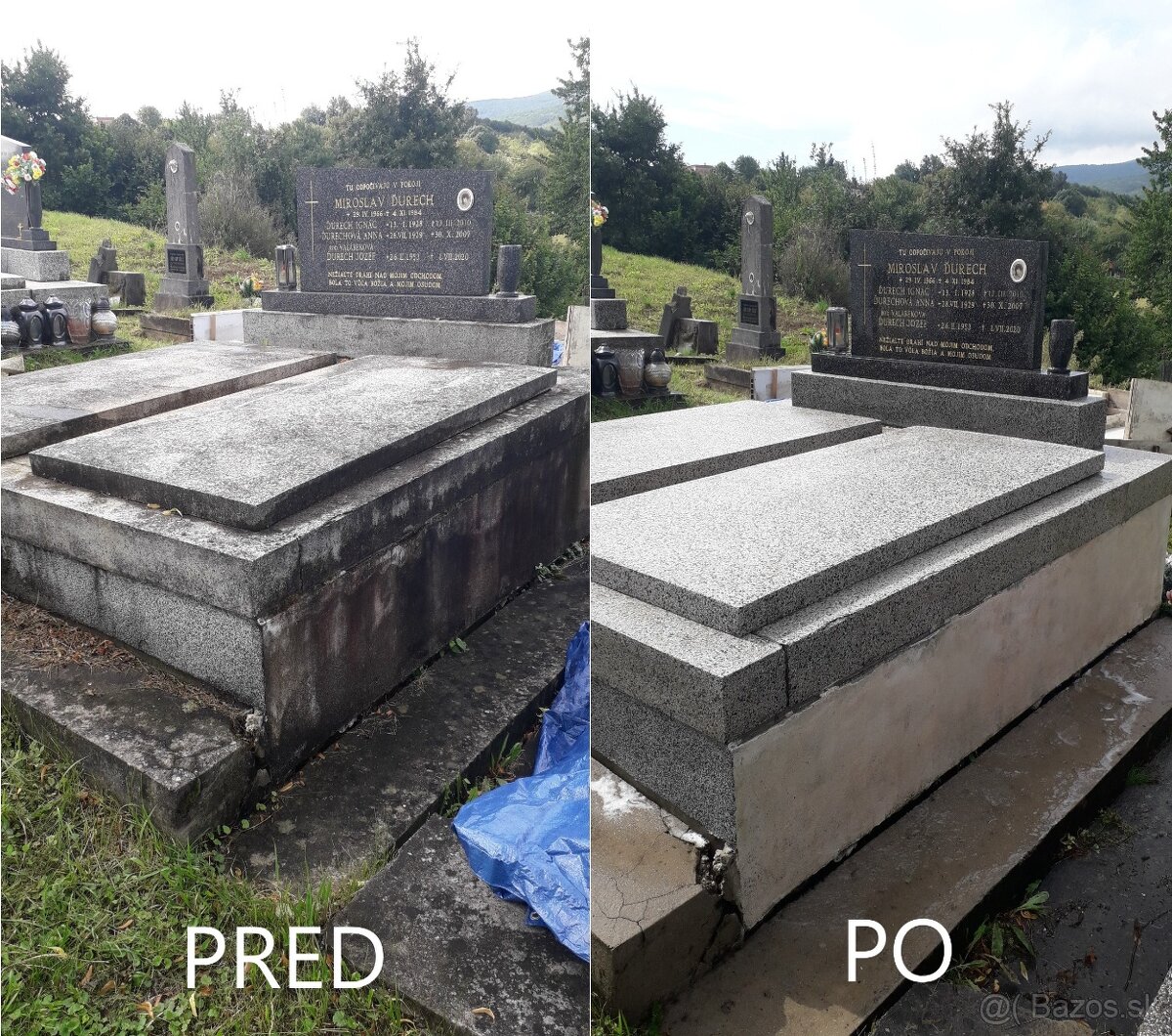 Už 15 rokov sme tu pre Vás, vykonávame čistenie a následné ošetrenie hrobového miesta. Zbavíme hrob plesne, rias, machu, lišajníkov, prachu a smogu. Čistenie prebieha ekologicky a šetrne, povrch sa neobrusuje a zostáva nepoškodený, čiže nedochádza k estetickým zmenám zovňajšku, následne po očistení sa povrch ošetrí prípravkom na to určeným, ktorý zabezpečuje jeho odolnosť voči poveternostným vplyvom.