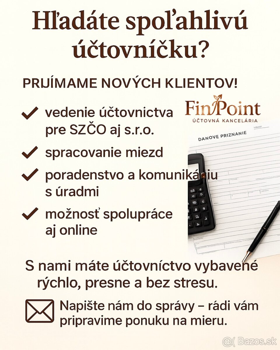 Komplexné podnikateľské účtovníctvo - TOP - [22.12. 2025]Vediem kompletné jednoduché a podvojné účtovníctvo v programe Pohoda, pripravím vám daňové priznania FO, PO, priznanie mot. vozidiel, výkazy DPH, priznanie zrážkovej dani, priznania a prehľady zo závislej činnosti. Mám dlhoročnú prax, som nápomocná a k dispozícii v poobedných a večerných hodinách.