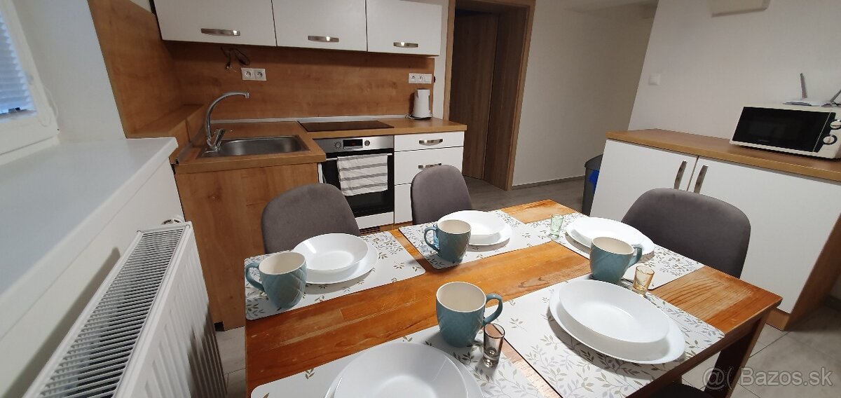 kuchyňa, 1x práčovňa (technická miestnosť). Vybavenie: TV v každej izbe , jedálenský stôl + stoličky, 3x chladnička s mrazničkou, mikrovlnná rúra, varná doska, el. rúra na pečenie, umývačka riadu, rýchlovarná kanvica, toastovač, kávovar, práčka. Dostupné: internet, TV . Cena je závislá od počtu osôb a dĺžky prenájmu. Mesačný prenájom, cena od 12€/osoba. Krátkodobý prenájom, individuálna kalkulácia. Viac foto na požiadanie. Max. kapacita 15 lôžok.