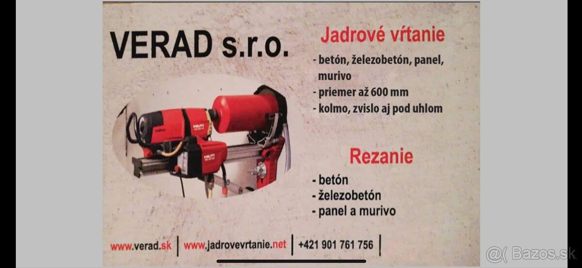 Ponúkame Vám jadrové vŕtanie do priemeru 600 mm a rezanie betónu,železobetónu,panelu,muriva.Rezanie balkónových dosiek. Viac info na tel. 0901 761 756 alebo www.verad.sk