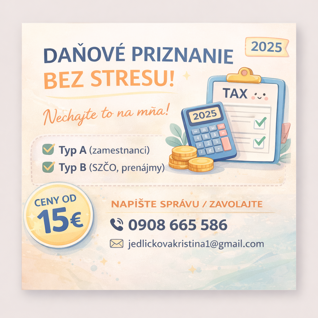 Daňové priznanie už od 20 EUR - [8.2. 2026]Bavia Vás papierovačky a stres pri podávaní daňového priznania? Potom tento inzerát nie je pre Vás.