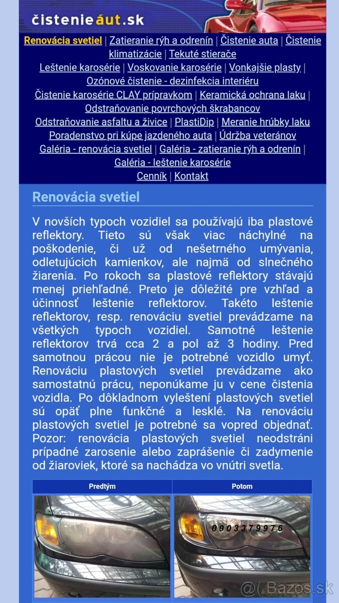 26 rokov na trhu, web stránka, Účet za platbu, Niekoľko tisíc zrenovovaných zožltnutych svetiel. Cena za kus 25,-( s účtom) viac na stránke Cistenieaut.sk ĎALEJ Ponúkame : kompletné čistenie,vysávanie - tepovanie, leštenie laku, zatieranie odrenin, odstránenie škrabancov, tekuté stierače, ozónová dezinfekcia, čistenie klimatizácie, impregnácia plastov, viackrokove leštenie laku, keramická ochrana karosérie, dekontaminacia, clay,