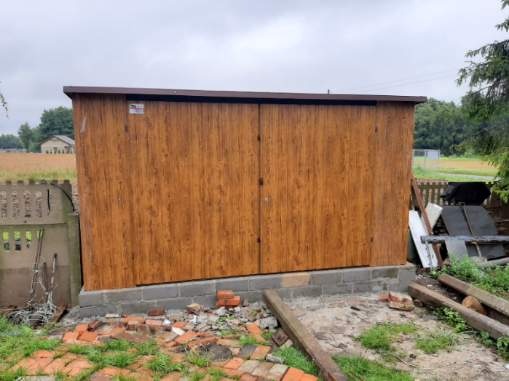 • Farby: steny, rohove lemovanie, brána a - drevený zlatý dub, strešné a strešné lemovanie - tmavo hnedá lesklá RAL8017