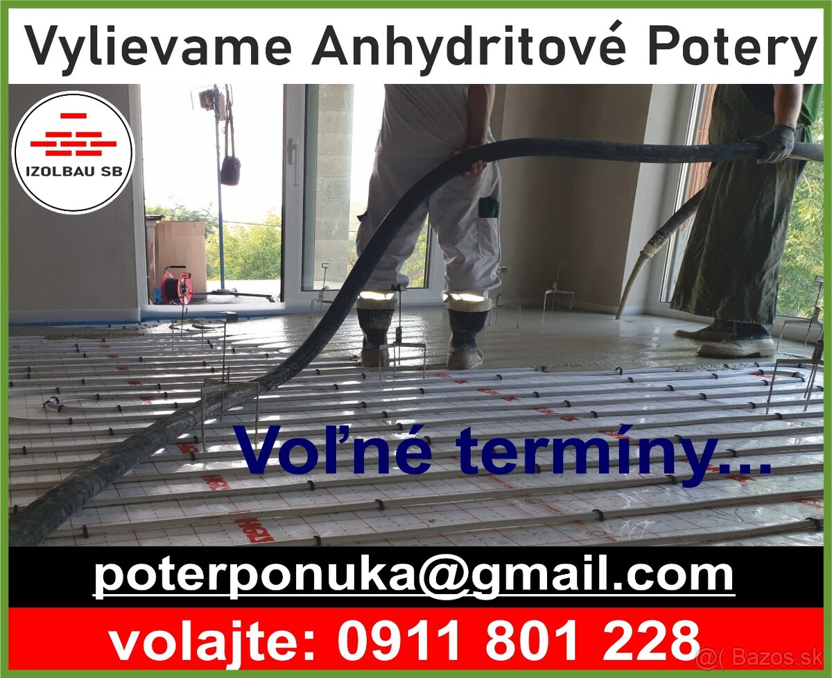 LIATE POTERY - ANHYDRITOVÝ a CEMENTOVÝ - [4.2. 2026]Anhydritové potery realizujeme už 14 rokov. Naše služby poskytujeme na celom západnom a strednom Slovensku. Ku každému klientovi pristupujeme individuálne. Na základe výmery a lokalizácie stavby Vám pošleme nezáväznú cenovú ponuku. Pred každou realizáciou Vás navštívi náš technik, ktorý stavbu zmer ...