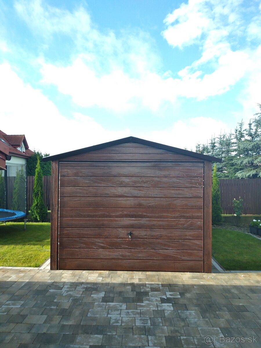 Superstal plechová garáž 3x5 - [4.2. 2026]Plechová garáž Superstal 3x5, strecha so zadným sklonom vo farbe dreva, s dvojkrídlovou bránou