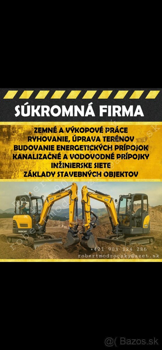 2x mini bager 2,2t JCB, zemné a výkopové práce, výkop základov, inžinierske siete, kanalizácie, úpravy terénu menšie búracie práce neváhajte nás kontaktovať sidlime v Bratislavskom kraji a nerobí nám prísť kam kolvek je treba ✌️ pekný deň prajeme