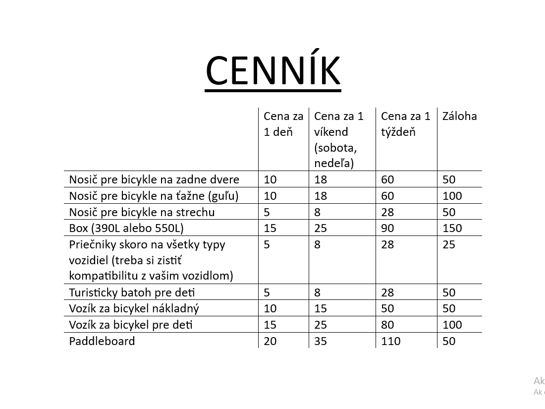 Požičovňa strešných boxov, nosičov bicyklov, nosičov na lyže alebo snowboardy a priečnikov na skoro všetky typy áut. Máme aj vozíky za bicykel (nákladne alebo pre deti), turistické nosiče pre deti a paddleboardy.