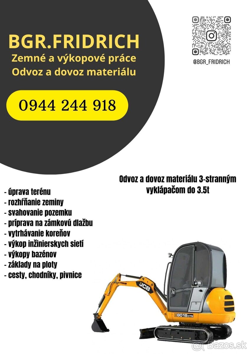 VÝKOPOVÉ PRÁCE MINIBAGROM - [19.3. 2026]Ponúkam zemné a výkopové práce minibagrom. Výkop základových pásov pre domy, ploty, výkop na inzinierske siete, šachty, drenáže, úprava terénu …. Lyžice šírky 30, 50, 60, 120